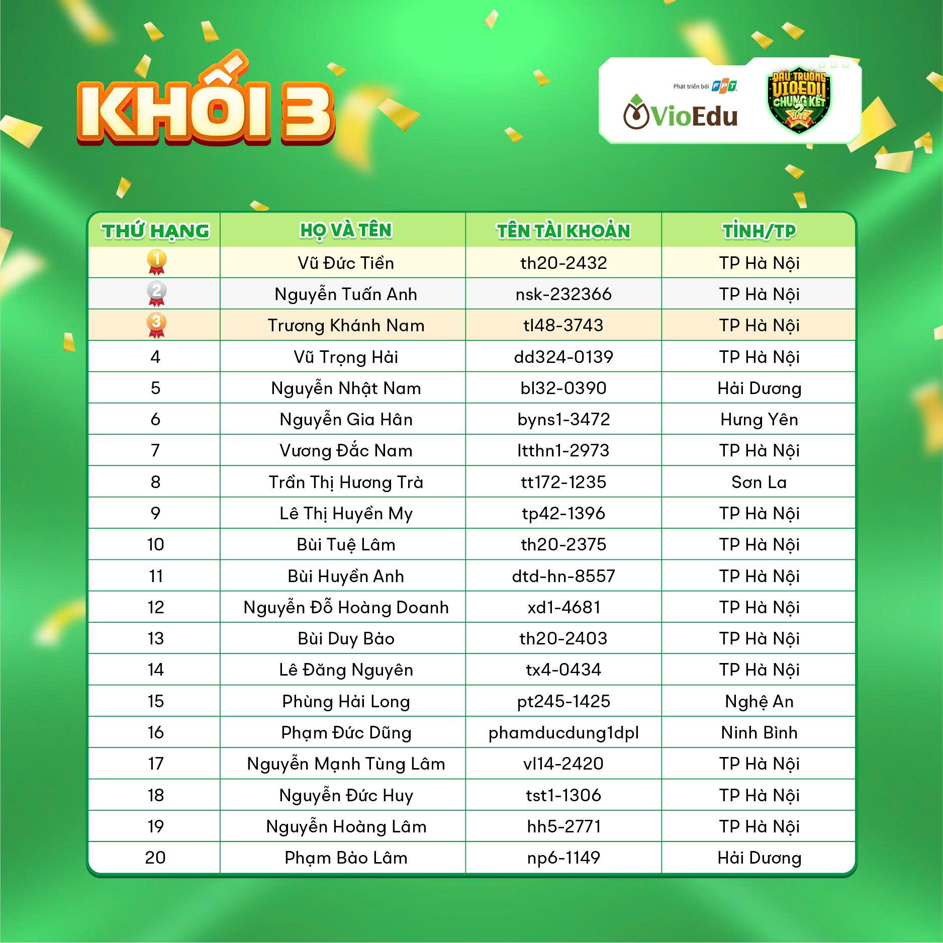 Trong vòng Chung kết 2 miền – Đấu trường VioEdu khu vực phía Bắc, Khánh Nam đã vượt qua hàng ngàn “chiến binh nhí” và xuất sắc giành vị trí TOP 3 – một thành tích cực kỳ đáng tự hào! 🏆✨