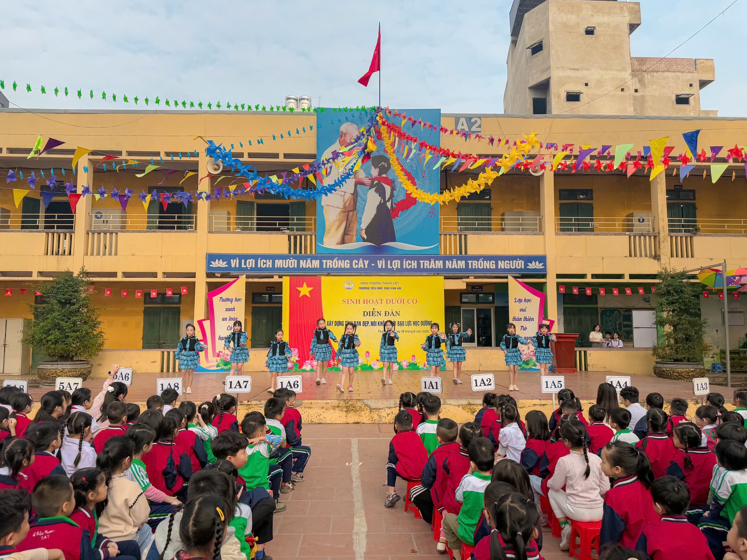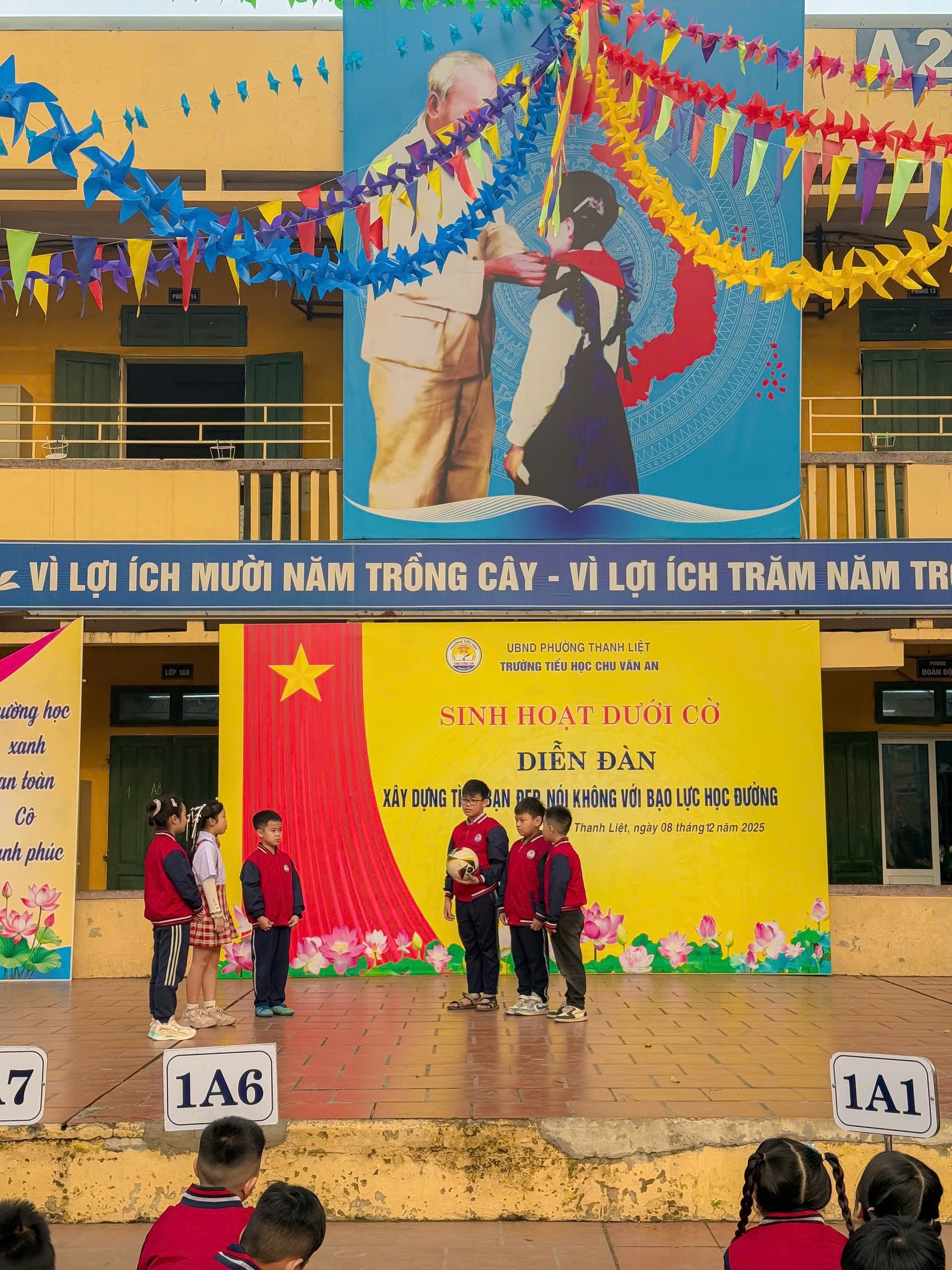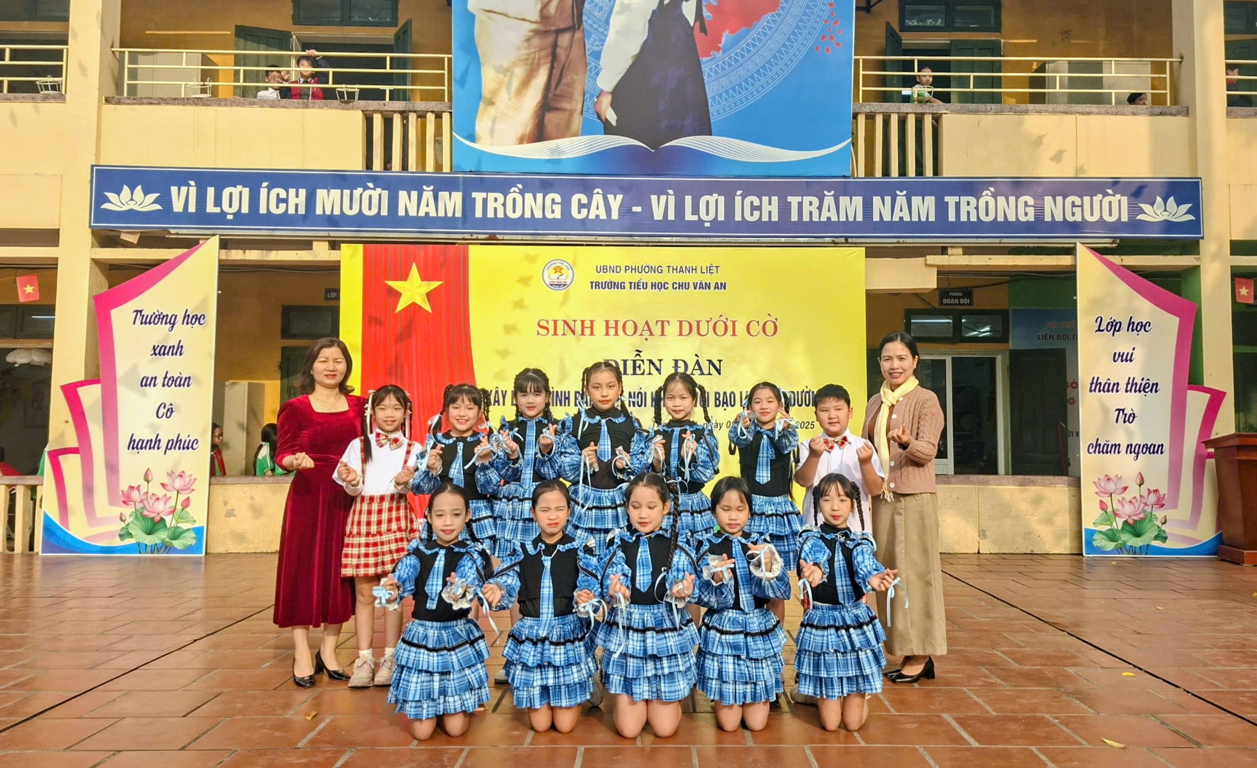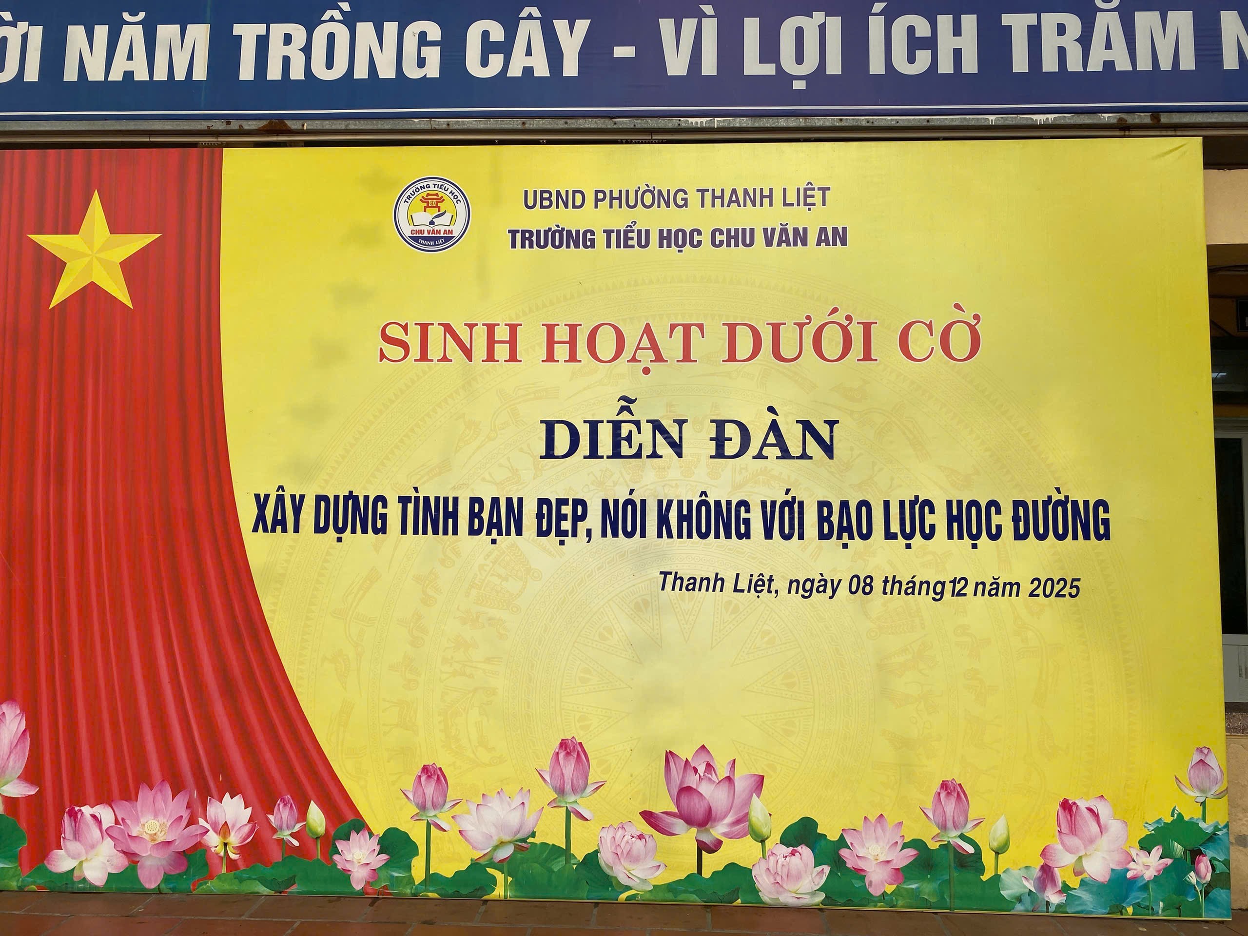 Trong thời gian gần đây, tại một số trường học đã xuất hiện nhiều vụ việc học sinh bị trêu chọc, cô lập hay thậm chí bạo lực thể chất. Những hành vi ấy không chỉ gây thương tổn về tinh thần mà còn để lại những hậu quả lâu dài đối với sự phát triển của các bạn. Chính vì vậy, việc tuyên truyền, giáo dục và nâng cao ý thức về phòng chống bạo lực học đường đang trở nên cấp thiết hơn bao giờ hết. Sáng thứ 2 đầu tuần ngày 08/12/2025, chi đội lớp 4A3 trường Tiểu học Chu Văn An – phường Thanh Liệt đã mang đến một buổi sinh hoạt dưới cờ đầy cảm xúc và nhân văn, góp phần lan tỏa thông điệp yêu thương đến toàn trường: “Xây dựng tình bạn đẹp, nói không với bạo lực học đường.”