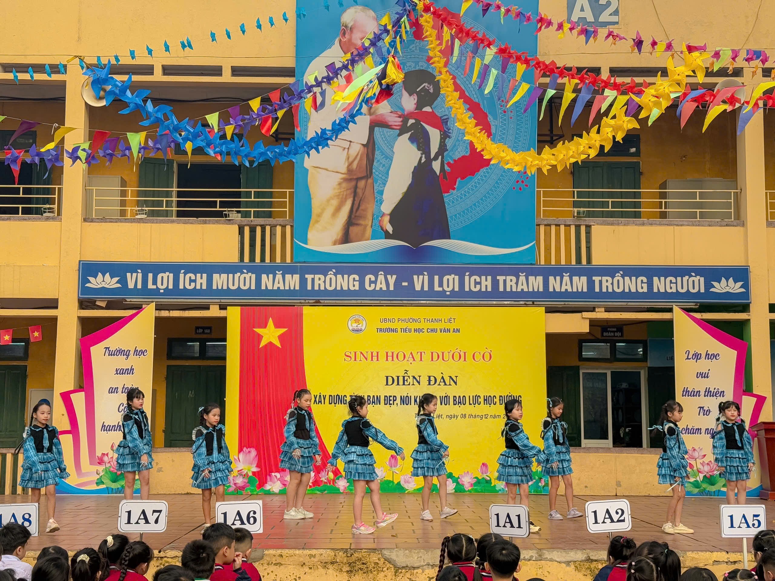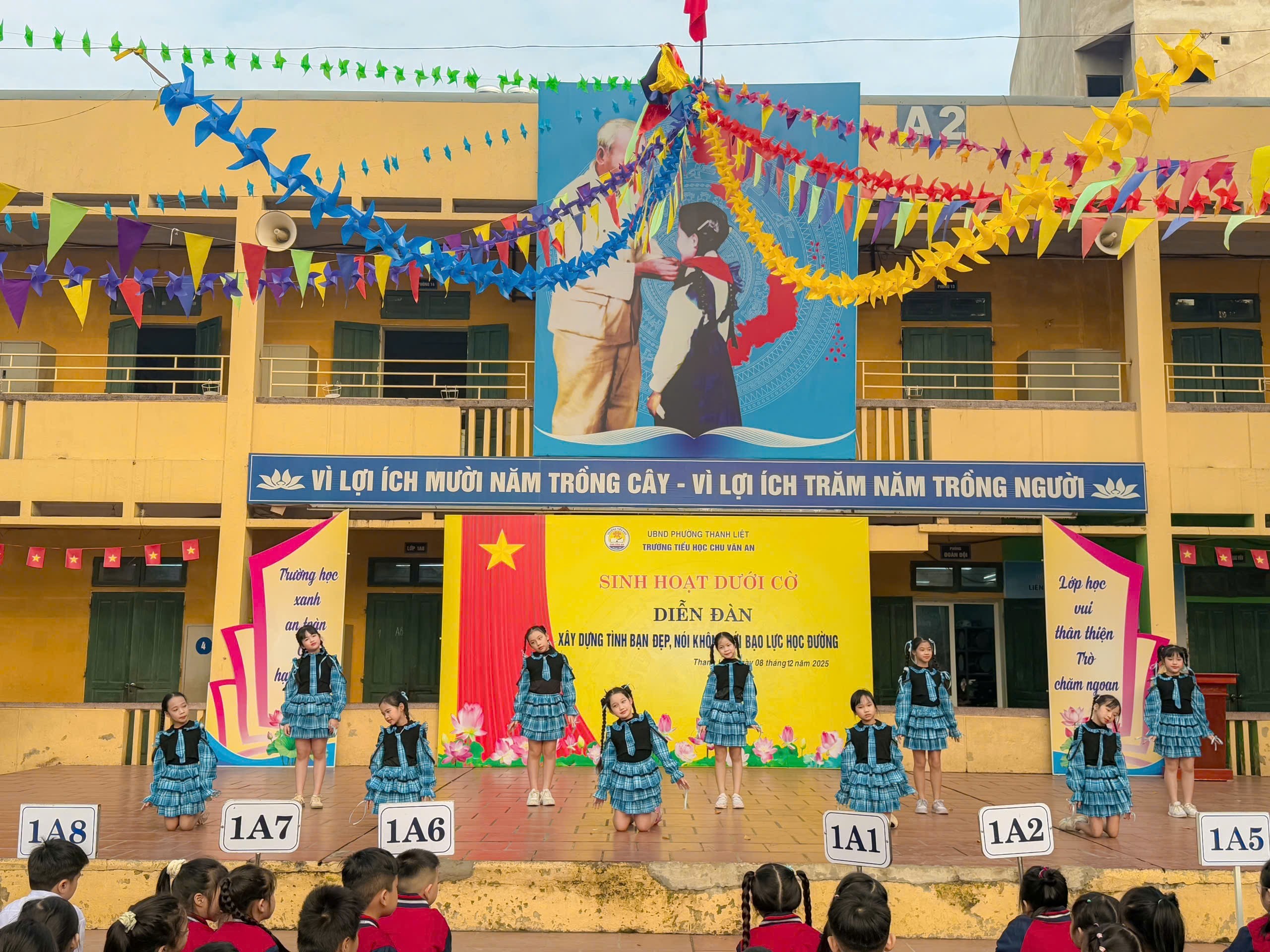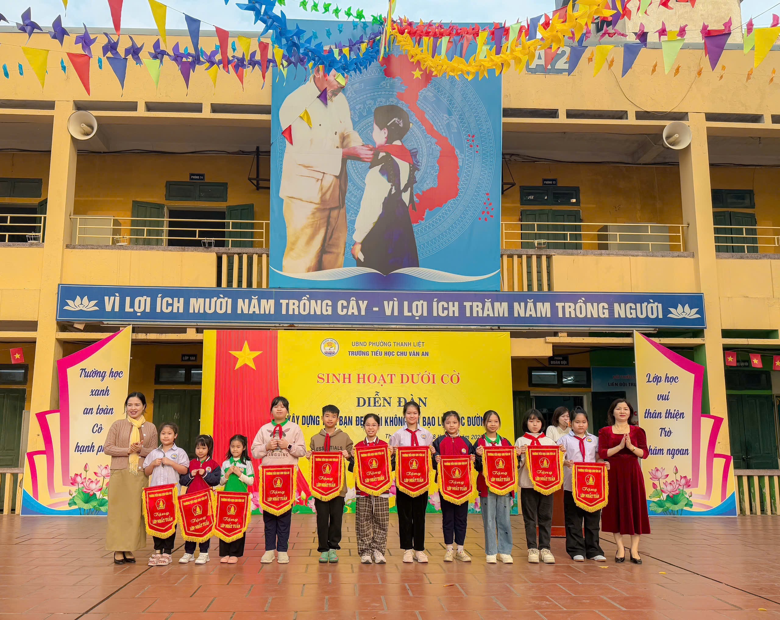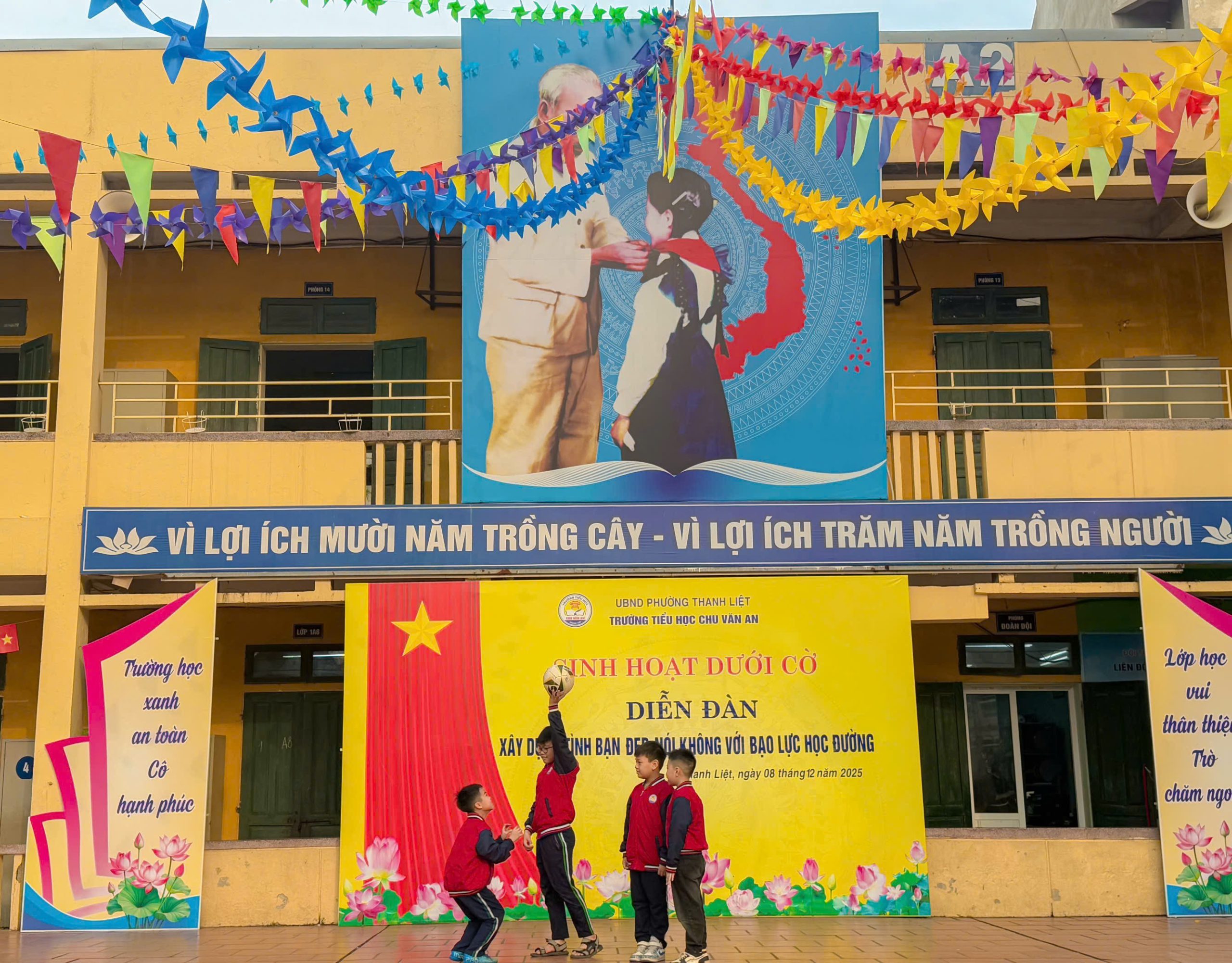 Trong thời gian gần đây, tại một số trường học đã xuất hiện nhiều vụ việc học sinh bị trêu chọc, cô lập hay thậm chí bạo lực thể chất. Những hành vi ấy không chỉ gây thương tổn về tinh thần mà còn để lại những hậu quả lâu dài đối với sự phát triển của các bạn. Chính vì vậy, việc tuyên truyền, giáo dục và nâng cao ý thức về phòng chống bạo lực học đường đang trở nên cấp thiết hơn bao giờ hết. Sáng thứ 2 đầu tuần ngày 08/12/2025, chi đội lớp 4A3 trường Tiểu học Chu Văn An – phường Thanh Liệt đã mang đến một buổi sinh hoạt dưới cờ đầy cảm xúc và nhân văn, góp phần lan tỏa thông điệp yêu thương đến toàn trường: “Xây dựng tình bạn đẹp, nói không với bạo lực học đường.”