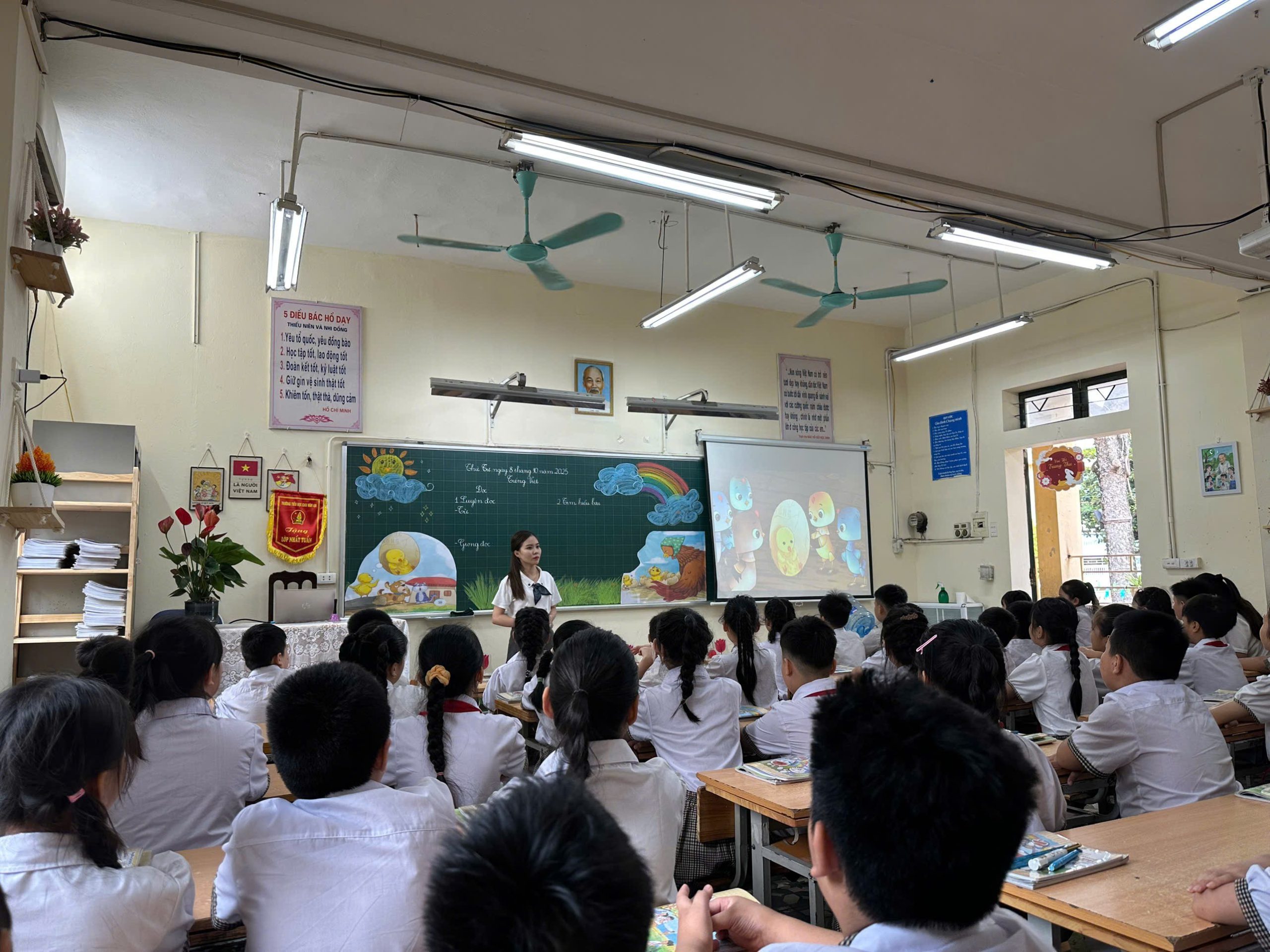 Cô giáo Trần Thúy An mở đầu chuỗi hội giảng với tiết Đọc: Bầu trời trong quả trứng. Giọng đọc nhẹ nhàng, cách dẫn dắt tinh tế đưa học sinh bước vào thế giới trong trẻo của ngôn từ. Giờ học sinh động, hấp dẫn, ươm vào lòng học trò tình yêu thiên nhiên và sự rung động trước cái đẹp bình dị.
