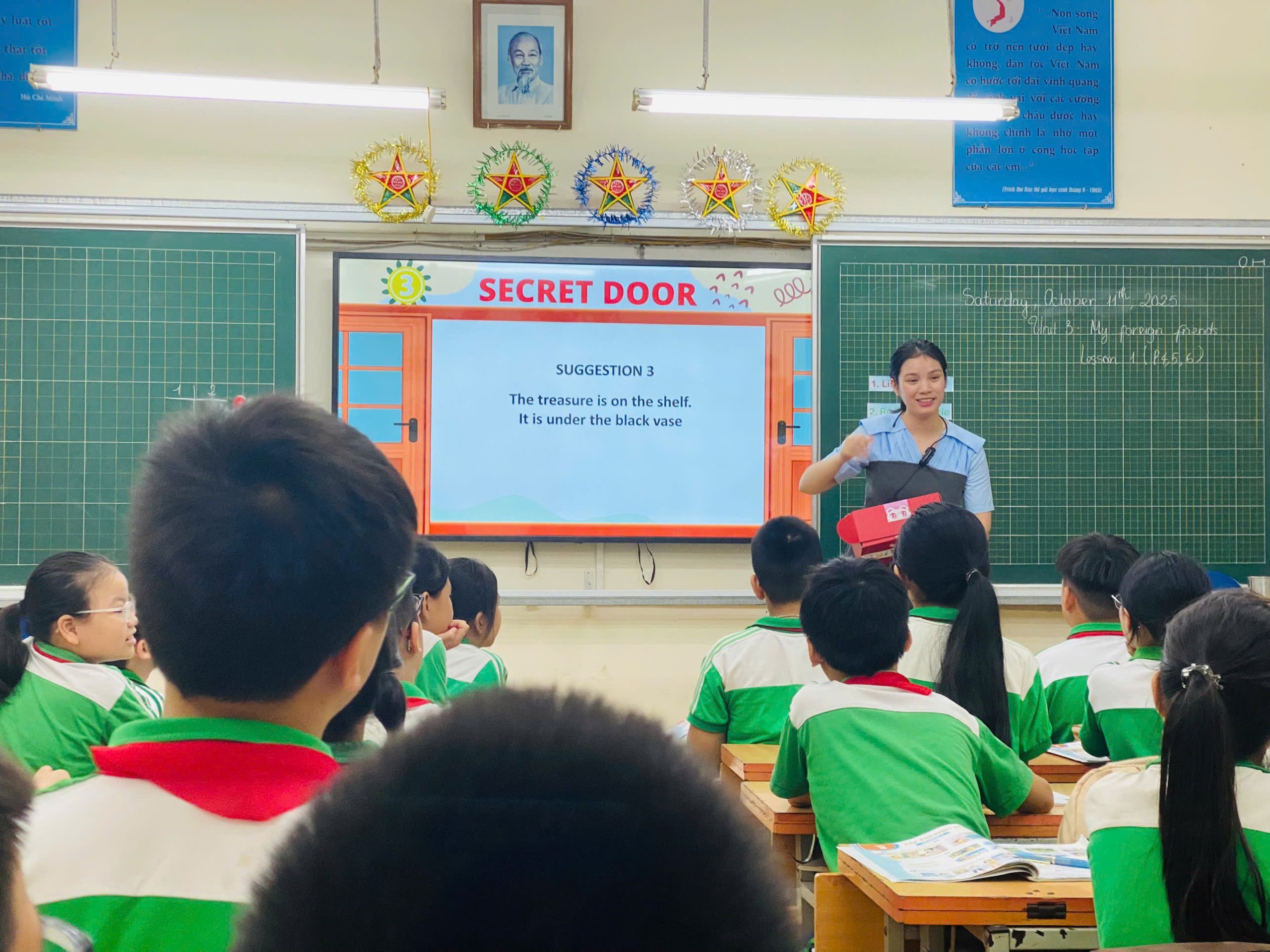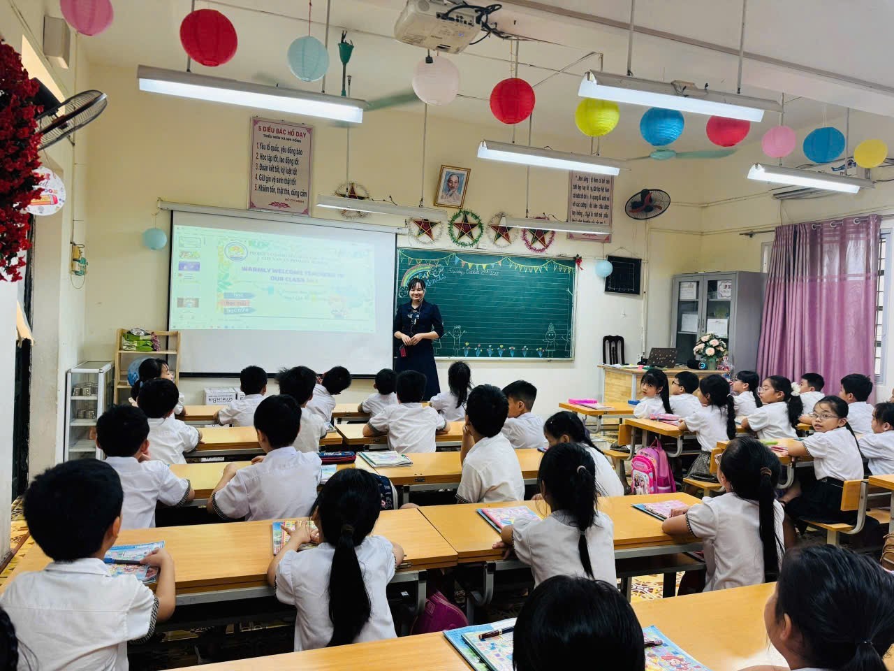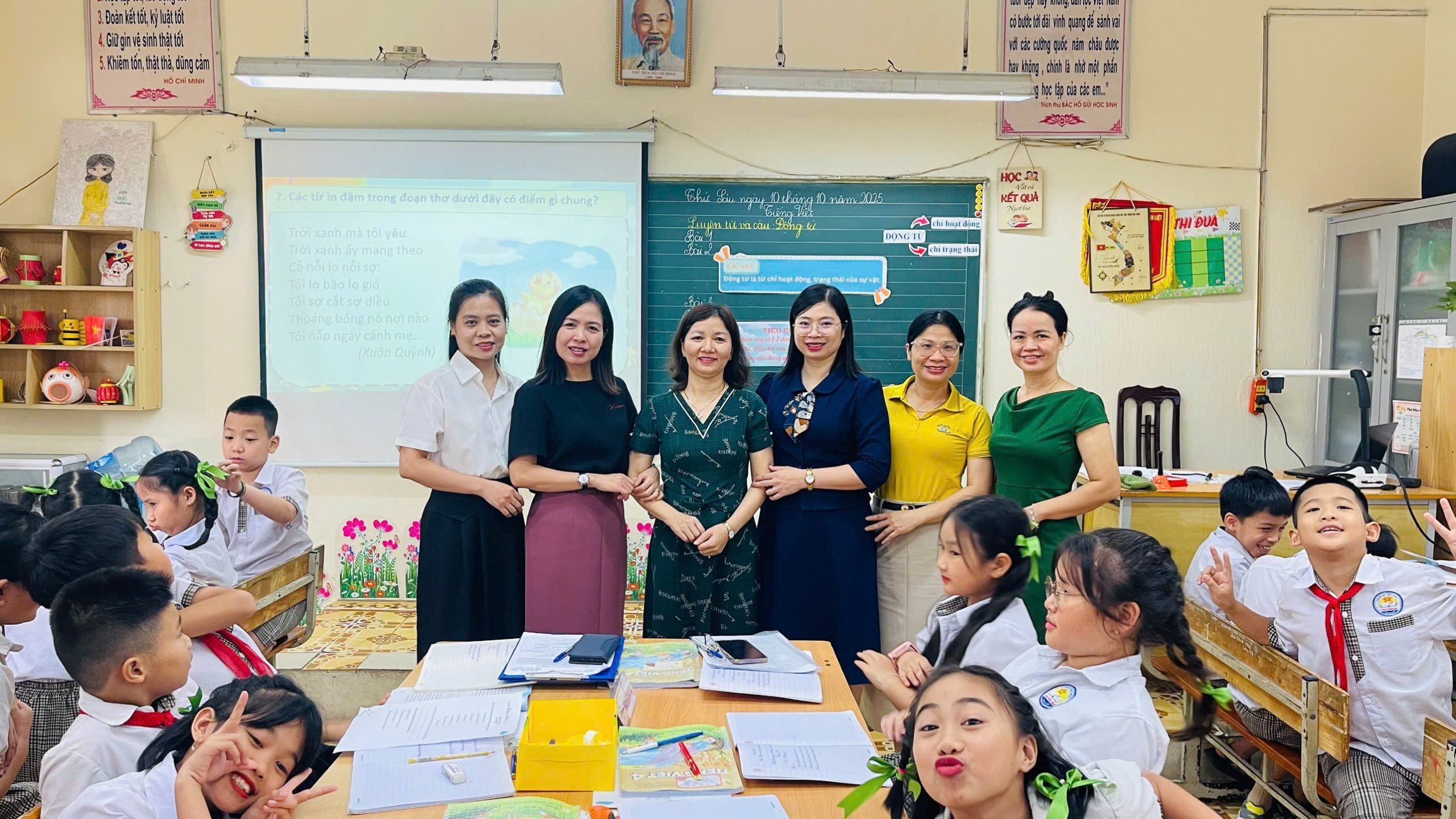 Cô giáo Nguyễn Thị Thu Phương tiếp nối với tiết Luyện từ và câu: Động từ đầy sinh động và sáng tạo. Bằng giọng nói truyền cảm và cách dẫn dắt tự nhiên, cô khéo léo đưa học sinh đi từ trò chơi học tập sôi nổi đến những hoạt động thảo luận, đóng vai, giao lưu thú vị. Mỗi em đều được tham gia, suy nghĩ và thể hiện ý kiến riêng. Kiến thức về động từ – tưởng chừng khô khan – bỗng trở nên gần gũi, dễ hiểu, gắn liền với những cảm xúc và hoạt động đời thường. Tiết học kết thúc trong tiếng cười, sự tự tin và niềm yêu thích tiếng Việt được nhân lên trong mỗi học sinh.
