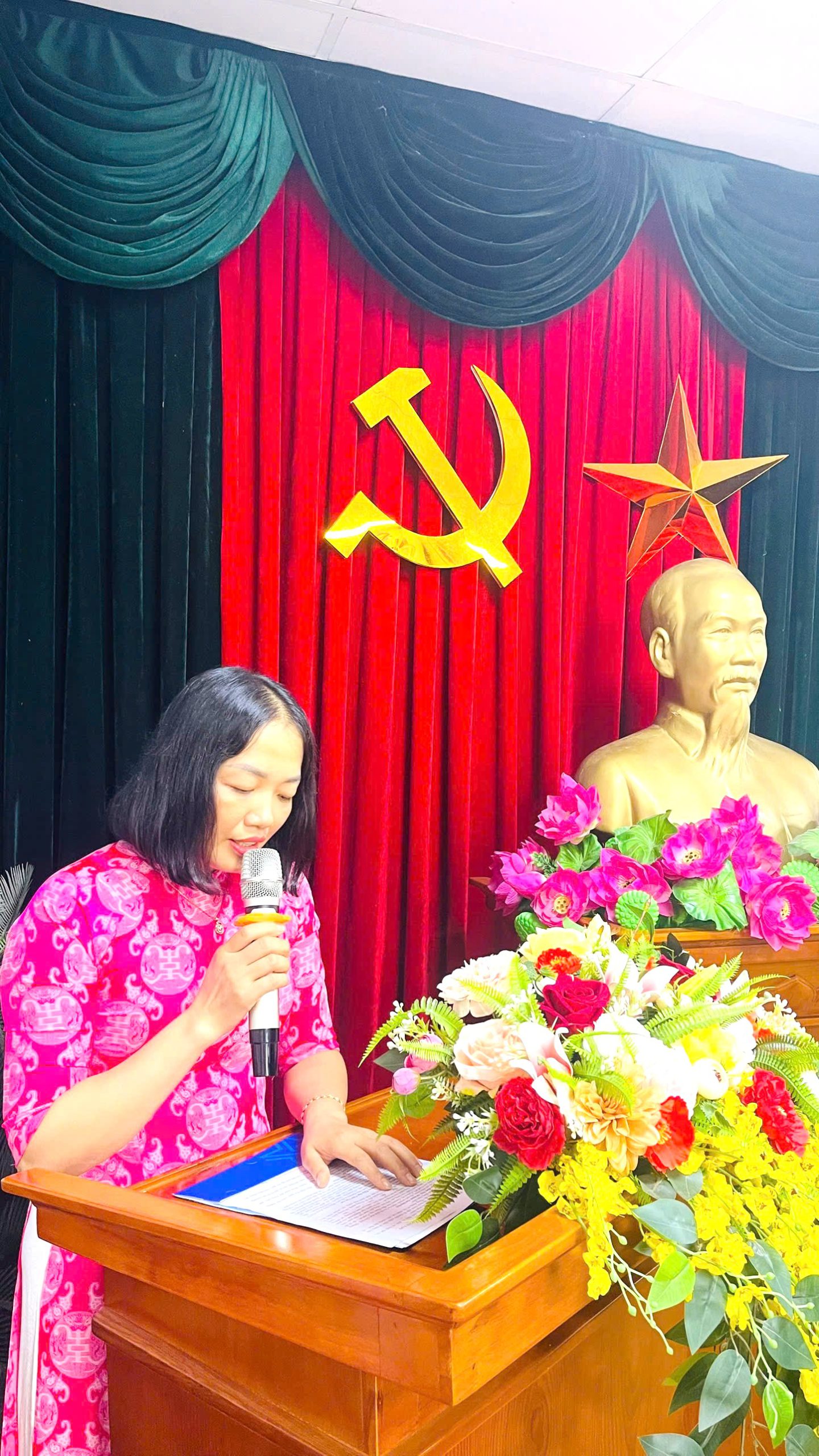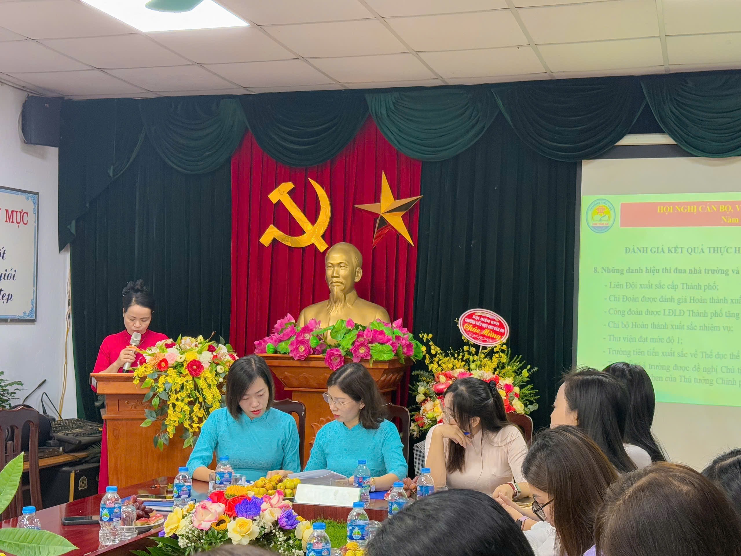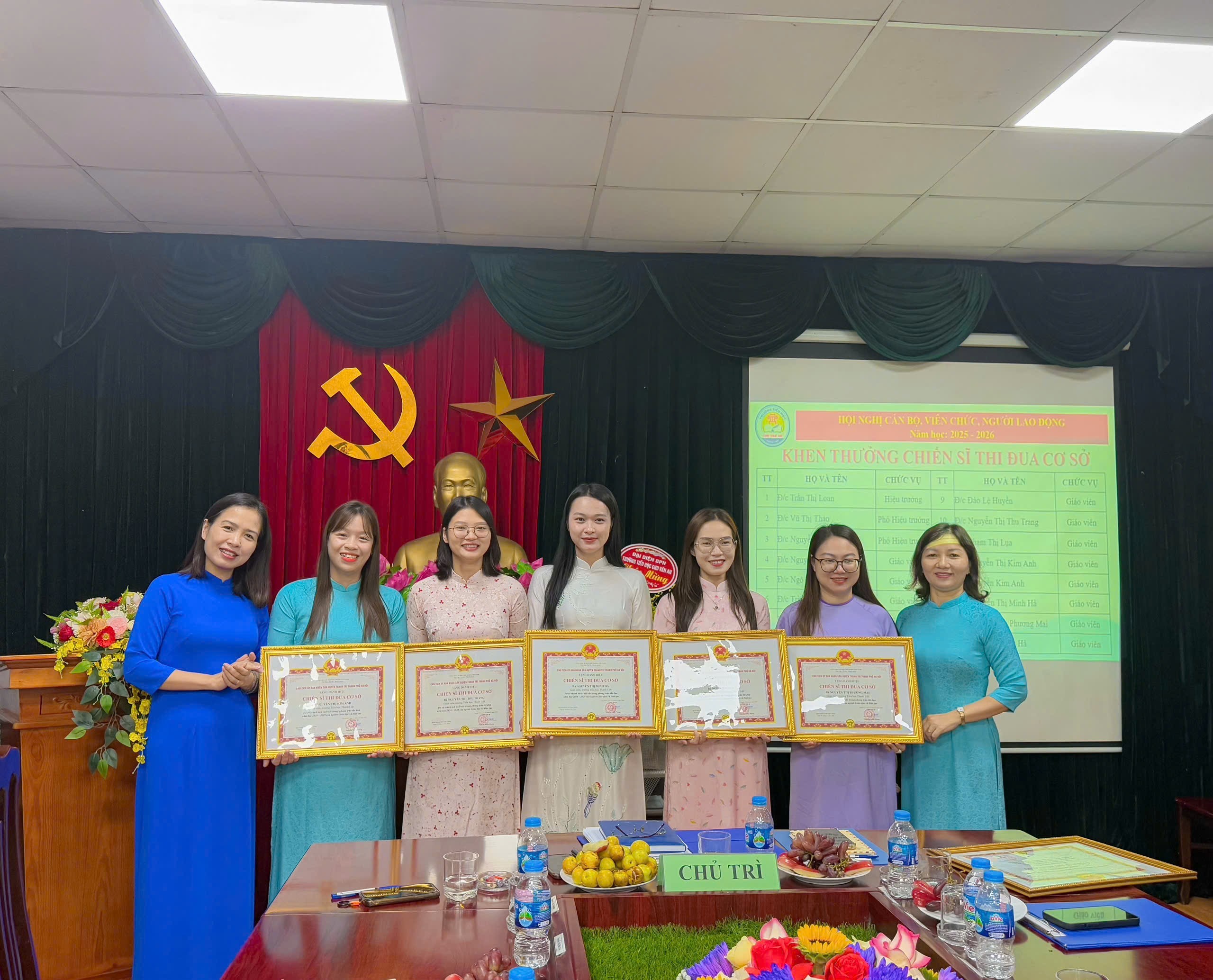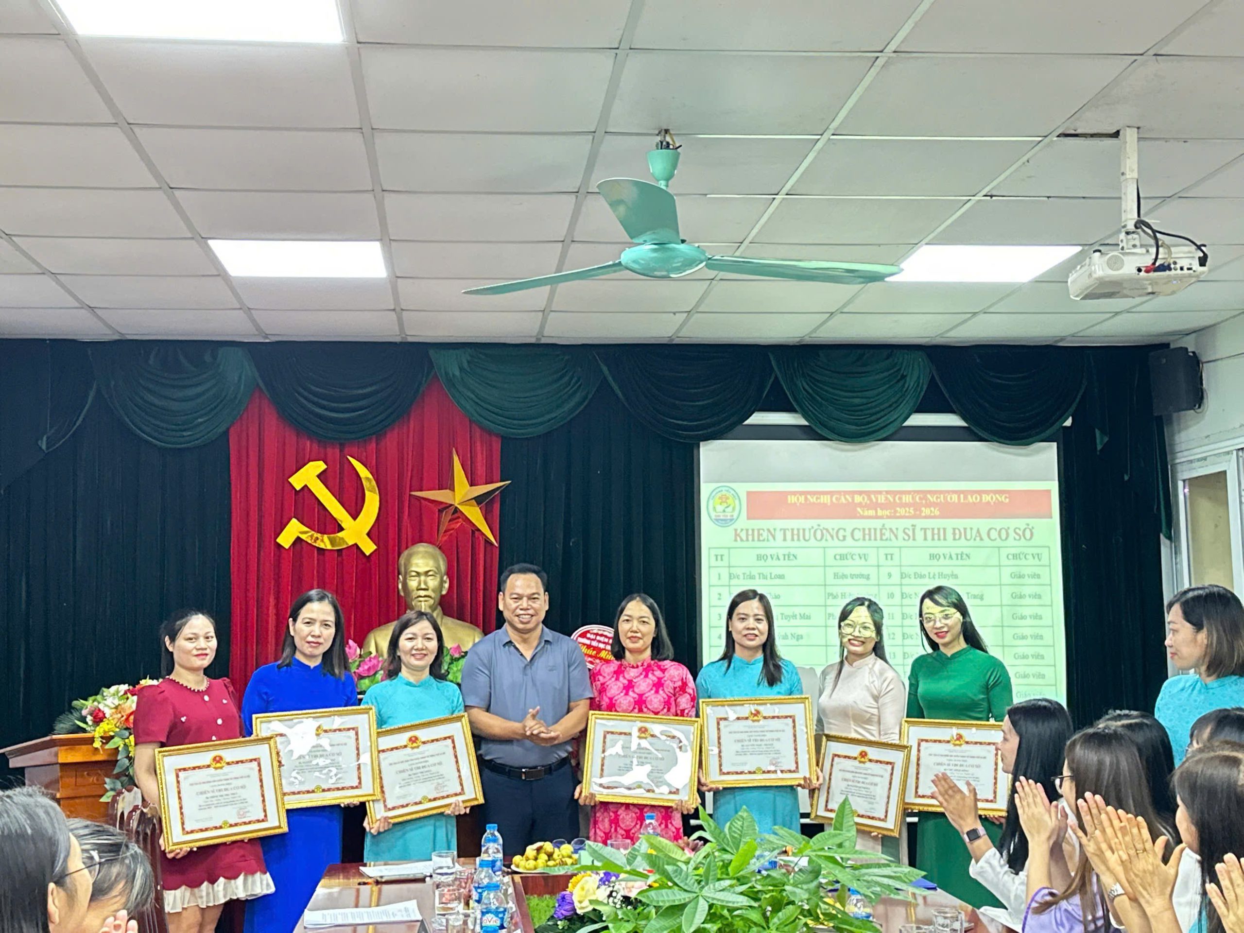 Hội nghị đã khen thưởng các tập thể, cá nhân có thành tích xuất sắc năm học 2024 – 2025. Sau đó, đồng chí Trần Thị Loan phát động phong trào thi đua năm học 2025 – 2026. Đại diện cán bộ, giáo viên, nhân viên – đồng chí Nguyễn Thị Minh Hà – phát biểu hưởng ứng, tạo nên khí thế sôi nổi và quyết tâm cao.