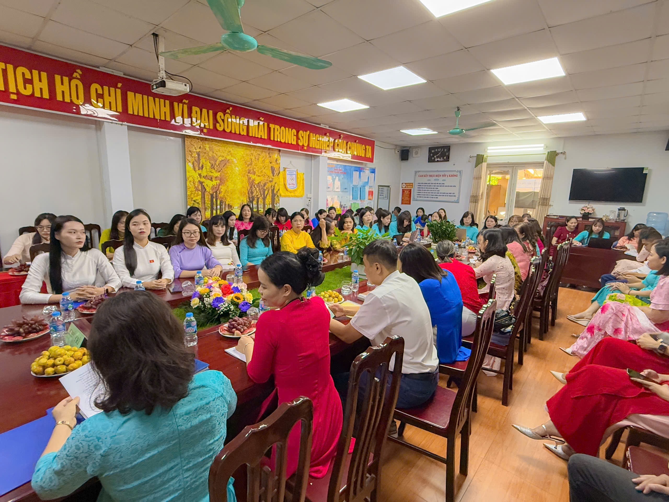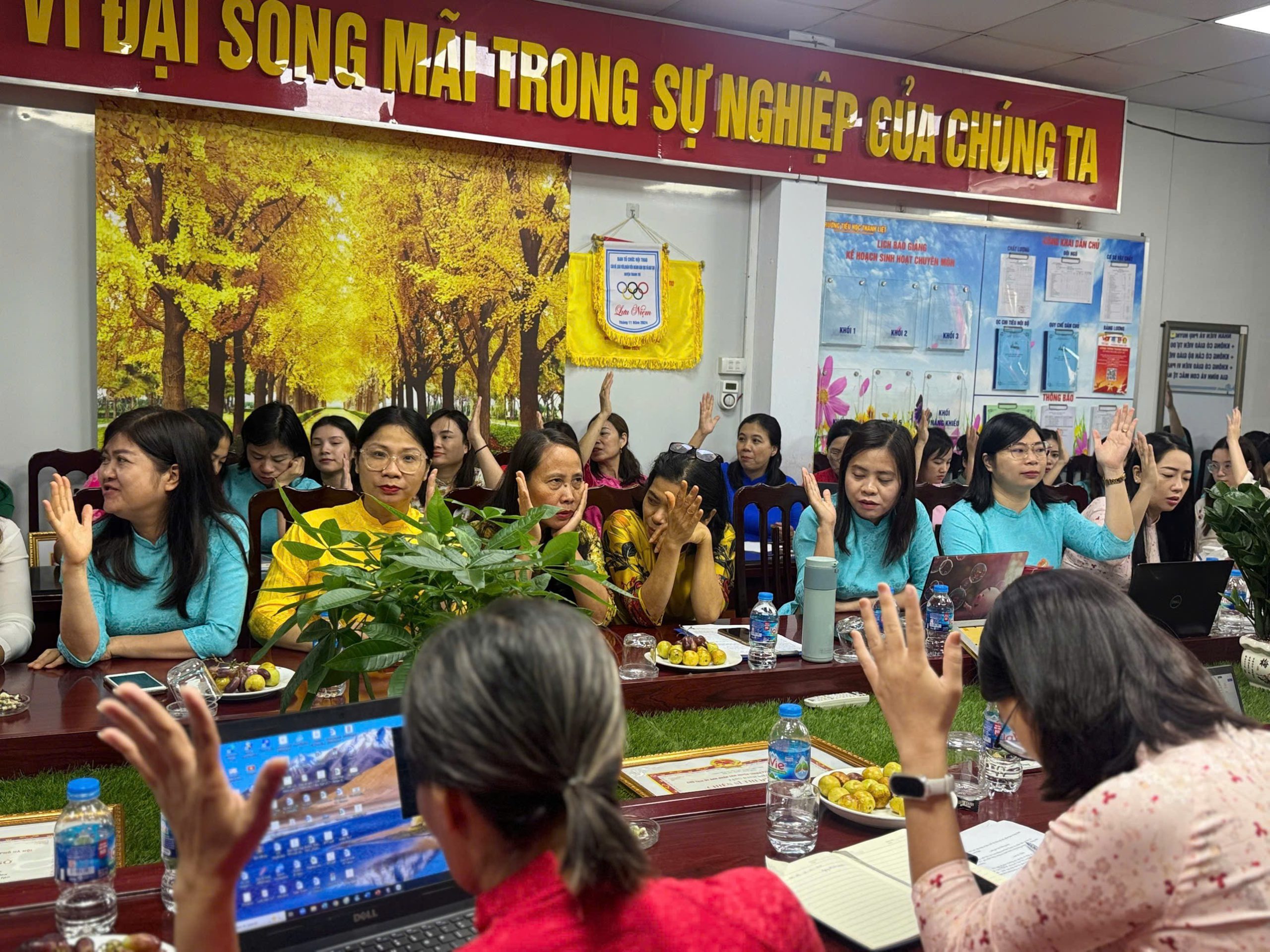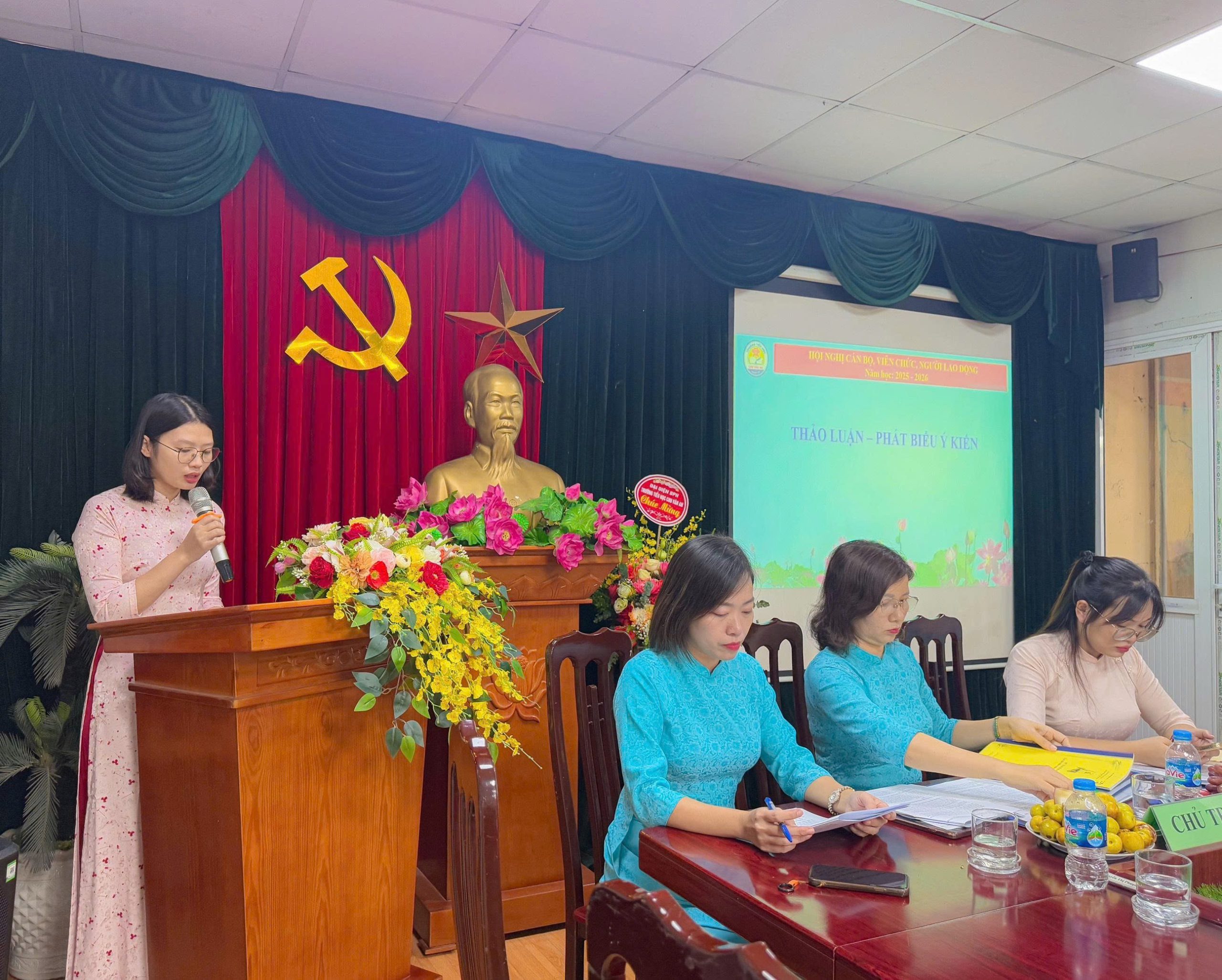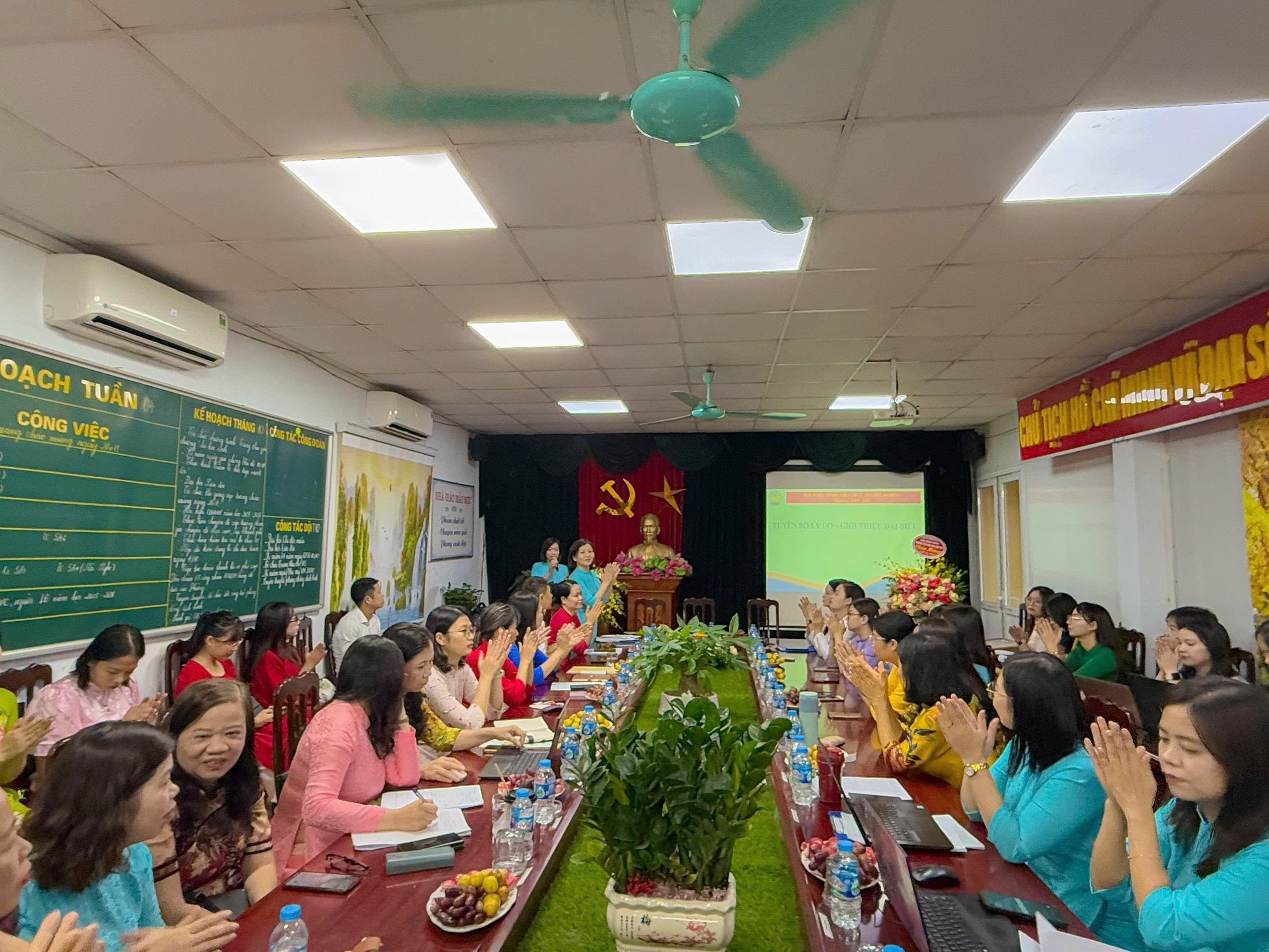 Hội nghị đã khen thưởng các tập thể, cá nhân có thành tích xuất sắc năm học 2024 – 2025. Sau đó, đồng chí Trần Thị Loan phát động phong trào thi đua năm học 2025 – 2026. Đại diện cán bộ, giáo viên, nhân viên – đồng chí Nguyễn Thị Minh Hà – phát biểu hưởng ứng, tạo nên khí thế sôi nổi và quyết tâm cao.
