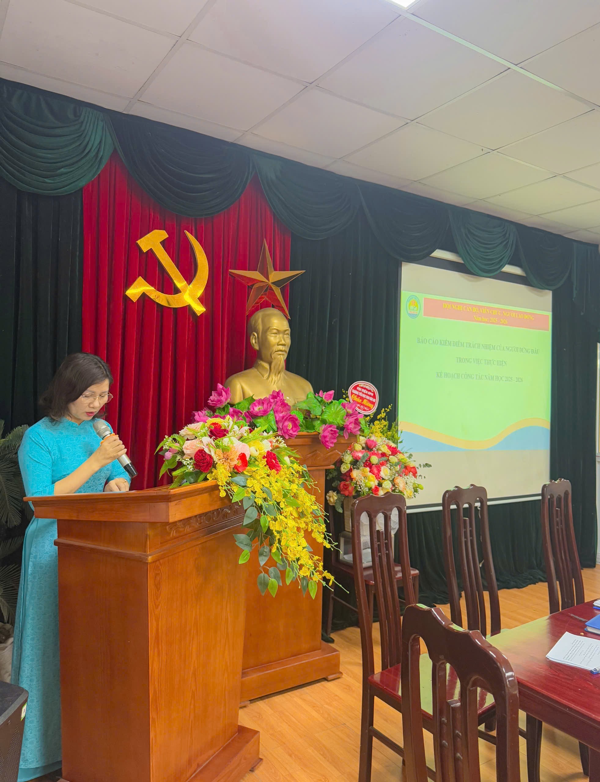 Hội nghị đã nghe đồng chí Vũ Thị Thảo – Phó BT Chi bộ, Phó Hiệu trưởng nhà trường trình bày dự thảo kế hoạch thực hiện nhiệm vụ năm học 2025 – 2026.