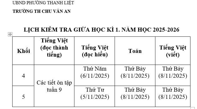 LỊCH KIỂM TRA GIỮA KÌ I NĂM HỌC 2025-2026