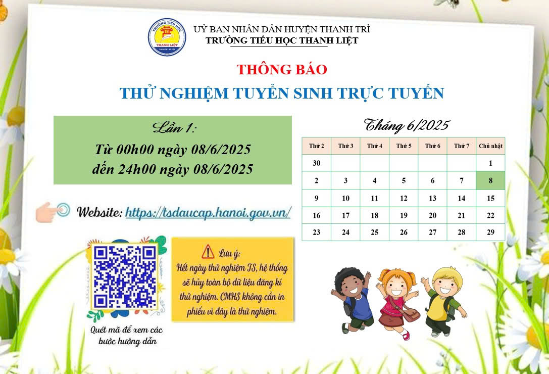 + Thử nghiệm Tuyển sinh vào lớp 1: từ 00 giờ 00 ngày 08/6/2025 đến 24 giờ 00 ngày 08/6/2025.