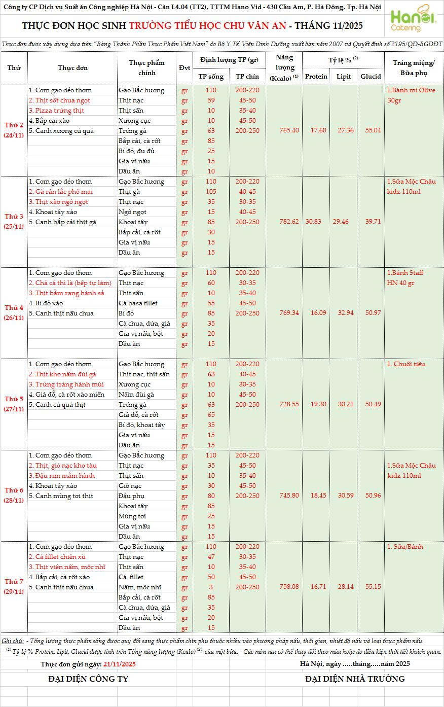 Thực đơn bán trú tuần 12 (Ngày 24/11 – 29/11/2025) 8:21 sáng 23/11/2025 154 lượt xem Xem chi tiết tại đây: Thực đơn bán trú tuần 12 Tweet Bài viết trước đó Lịch công tác tuần 12 (Ngày 24/11 – 29/11/2025) Bài viết sau đó LỄ KỶ NIỆM 43 NĂM NGÀY NHÀ GIÁO VIỆT NAM 20/11 VÀ ĐÓN NHẬN BẰNG KHEN THỦ TƯỚNG CHÍNH PHỦ Bài viết liên quanThực đơn bán trú tuần 32Thực đơn bán trú tuần 31 (Ngày 20/4- 25/4/2026)Thực đơn bán trú tuần 30 (Ngày 13/4-18/4/2026)THÔNG TIN CỦA CÔNG TY CỔ PHẦN DỊCH VỤ SUẤT ĂN CÔNG NGHIỆP HÀ NỘI VÀ VIỆC PHỐI HỢP VỚI NHÀ TRƯỜNG, PHỤ HUYNH HỌC SINH ĐỂ ĐẢM BẢO AN TOÀN THỰC PHẨMThực đơn bán trú tuần 29 (Ngày 6/4- 11/4/2026)THÔNG BÁO LIÊN QUAN ĐẾN NGUỒN THỰC PHẨM CHO BỮA ĂN BÁN TRÚ TẠI TRƯỜNG TIỂU HỌC CHU VĂN AN