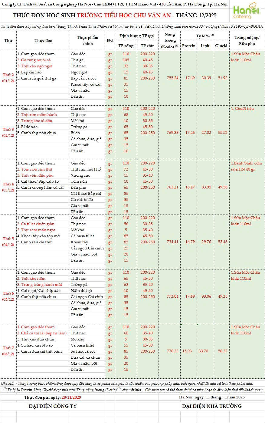 Thực đơn bán trú tuần 13(Ngày 1/12- 6/12/2025)