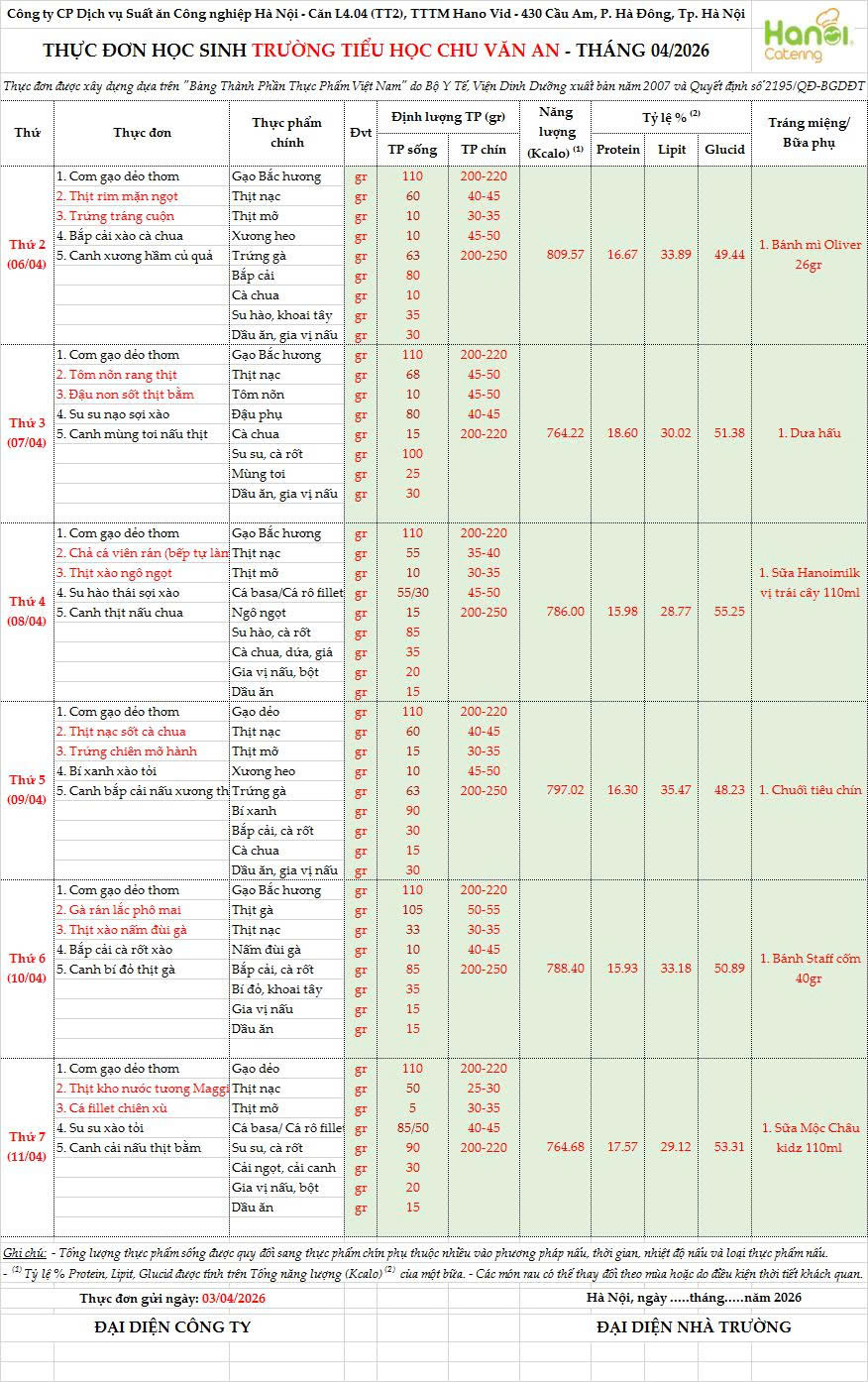 Thực đơn bán trú tuần 29 (Ngày 6/4- 11/4/2026)