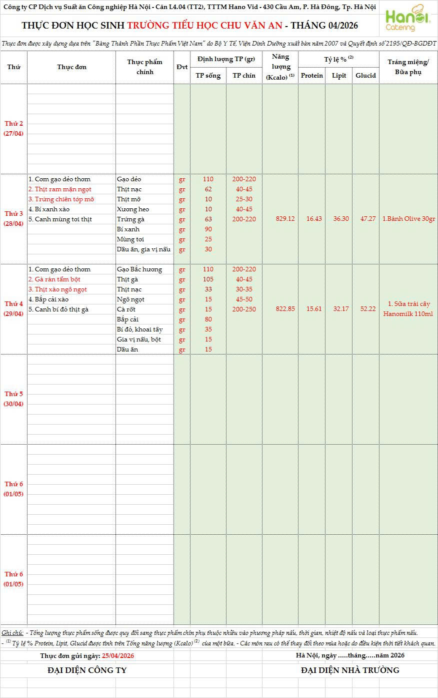 - Thực đơn bán trú tuần 31 (Ngày 20/4- 25/4/2026)