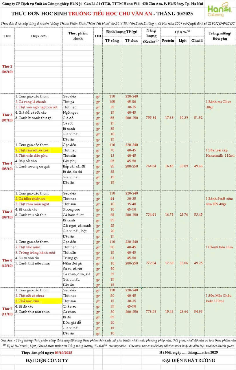 Thực đơn bán trú tuần 5 (Ngày 6/10- 11/10/2025)