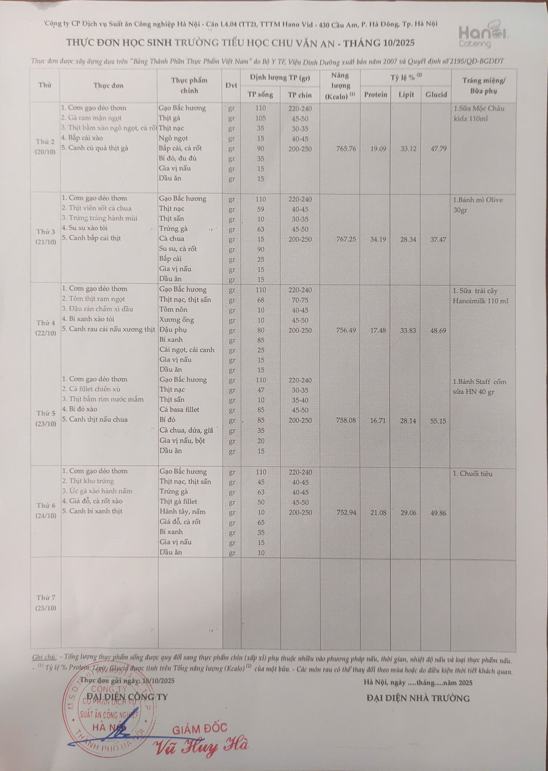 Thực đơn bán trú tuần 7 (Ngày 20/10 – 25/10/2025)