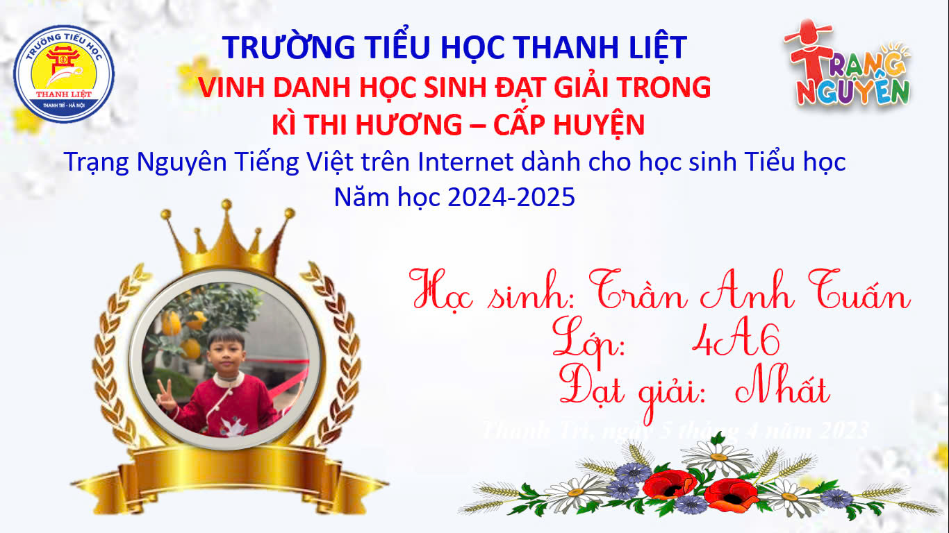 VINH DANH HỌC SINH ĐẠT GIẢI TRẠNG NGUYÊN TIẾNG VIỆT CẤP HUYỆN NĂM HỌC 2024 – 2025 9:13 chiều 24/03/2025 1994 lượt xem Tweet Bài viết trước đó TRƯỜNG TIỂU HỌC THANH LIỆT TỔ CHỨC THÀNH CÔNG LỄ KHAI MẠC HỘI KHỎE PHÙ ĐỔNG – NGÀY HỘI THIẾU NHI VUI KHỎE- TIẾN BƯỚC LÊN ĐOÀN Bài viết sau đó TRƯỜNG TIỂU HỌC THANH LIỆT VÀ TRƯỜNG TIỂU HỌC VĂN AN GIAO LƯU, CHIA SẺ KINH NGHIỆM GIÁO DỤC Bài viết liên quanSINH HOẠT DƯỚI CỜ CHỦ ĐIỂM: “THIẾU NHI THỦ ĐÔ LÀM NGHÌN VIỆC TỐT”THÔNG TIN CỦA CÔNG TY CỔ PHẦN DỊCH VỤ SUẤT ĂN CÔNG NGHIỆP HÀ NỘI VÀ VIỆC PHỐI HỢP VỚI NHÀ TRƯỜNG, PHỤ HUYNH HỌC SINH ĐỂ ĐẢM BẢO AN TOÀN THỰC PHẨMTRƯỜNG TIỂU HỌC CHU VĂN AN – PHƯỜNG THANH LIỆT HƯỞNG ỨNG CHIẾN DỊCH “HỌC ĐƯỜNG XANH – GIEO MẦM TƯƠNG LAI”TOẢ SÁNG CÙNG ĐAM MÊ TẠI CUỘC THI TIN HỌC TRẺ QUỐC TẾ THÀNH PHỐ HÀ NỘI NĂM HỌC 2025 – 2026Thông báo về việc phun thuốc diệt côn trùng, sâu bọ và phòng chống muỗi trong trường họcVINH DANH HỌC SINH TOP ĐẦU CUỘC THI TÀI NĂNG TIN HỌC TRẺ QUỐC TẾ VÒNG CẤP PHƯỜNG THANH LIỆT