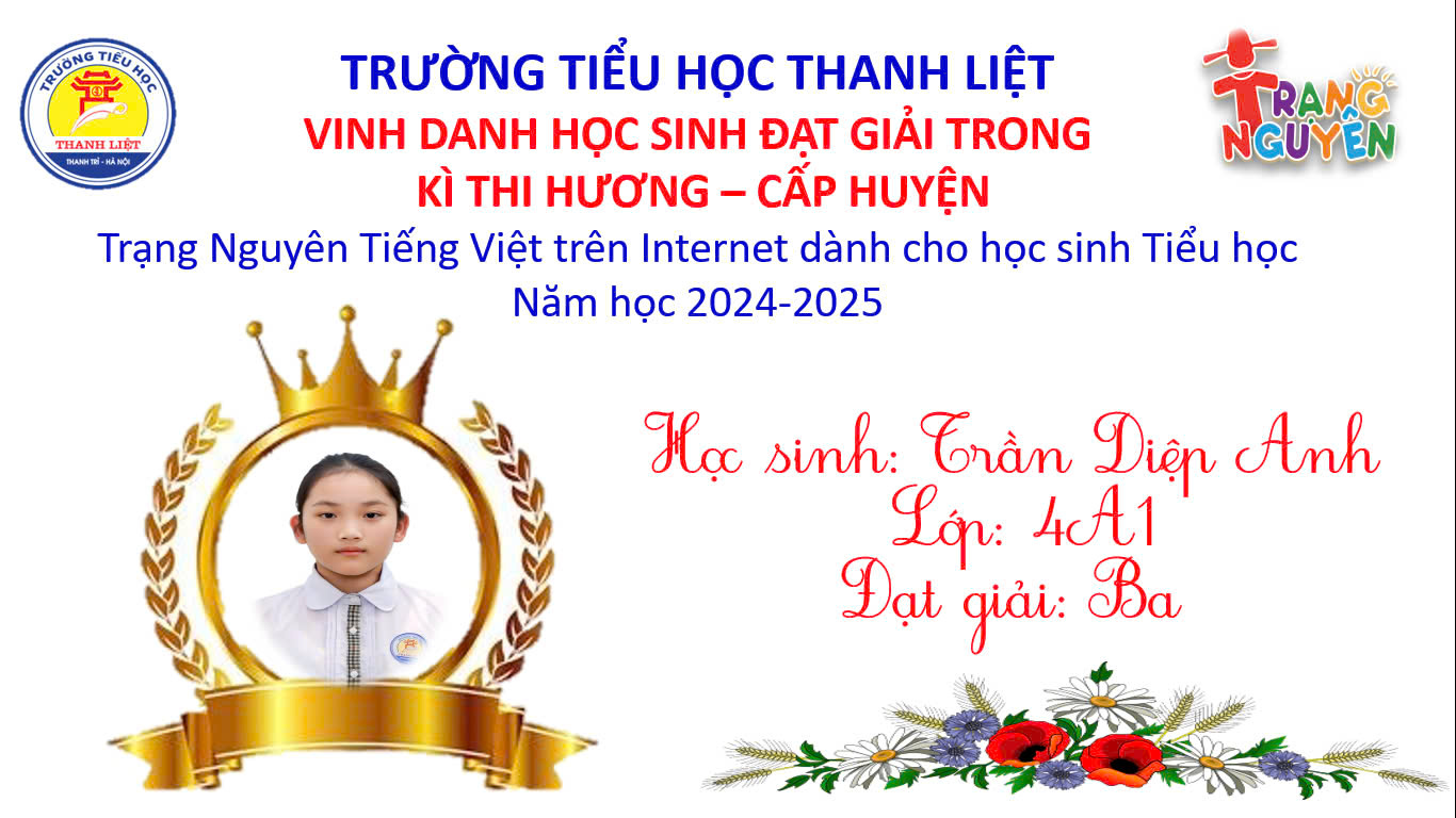 VINH DANH HỌC SINH LỚP 4 ĐẠT GIẢI TRONG CUỘC THI TRẠNG NGUYÊN TIẾNG VIỆT CẤP HUYỆN 10:15 chiều 21/03/2025 543 lượt xem Tweet Bài viết trước đó CHĂM SÓC SỨC KHỎE TÂM THẦN CHO HỌC SINH TRƯỜNG TIỂU HỌC THANH LIỆT Bài viết sau đó Hưởng ứng Tuần lễ Áo dài tại Trường Tiểu học Thanh Liệt Bài viết liên quanSINH HOẠT DƯỚI CỜ CHỦ ĐIỂM: “THIẾU NHI THỦ ĐÔ LÀM NGHÌN VIỆC TỐT”THÔNG TIN CỦA CÔNG TY CỔ PHẦN DỊCH VỤ SUẤT ĂN CÔNG NGHIỆP HÀ NỘI VÀ VIỆC PHỐI HỢP VỚI NHÀ TRƯỜNG, PHỤ HUYNH HỌC SINH ĐỂ ĐẢM BẢO AN TOÀN THỰC PHẨMTRƯỜNG TIỂU HỌC CHU VĂN AN – PHƯỜNG THANH LIỆT HƯỞNG ỨNG CHIẾN DỊCH “HỌC ĐƯỜNG XANH – GIEO MẦM TƯƠNG LAI”TOẢ SÁNG CÙNG ĐAM MÊ TẠI CUỘC THI TIN HỌC TRẺ QUỐC TẾ THÀNH PHỐ HÀ NỘI NĂM HỌC 2025 – 2026Thông báo về việc phun thuốc diệt côn trùng, sâu bọ và phòng chống muỗi trong trường họcVINH DANH HỌC SINH TOP ĐẦU CUỘC THI TÀI NĂNG TIN HỌC TRẺ QUỐC TẾ VÒNG CẤP PHƯỜNG THANH LIỆT